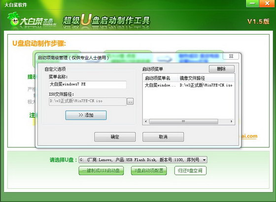 大白菜及大方便用戶制作U盤啟動制作,提供了更高一級的定制啟動系統,舉例說明: