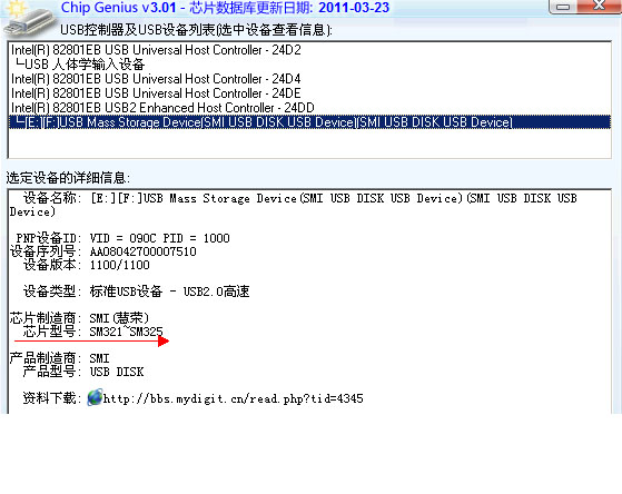 圖片上紅色箭頭上面的smi慧榮字樣,就是說的u盤的主控芯片。所謂的量產操作,也是要根據主控芯片選擇合適的量產工具。這個以后我們還會詳細的介紹。