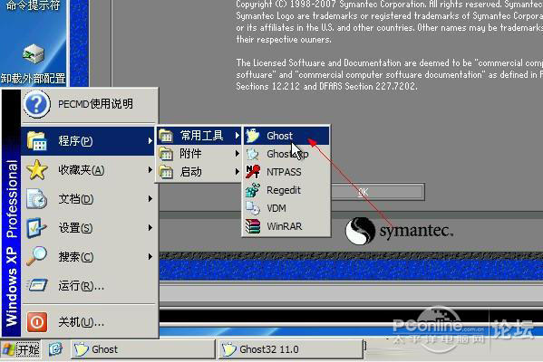 進入WinPE系統(tǒng)后,點擊[開始]-[程序]-[常用工具]-[Ghost]打開WinPE系統(tǒng)帶的GHOST軟件。