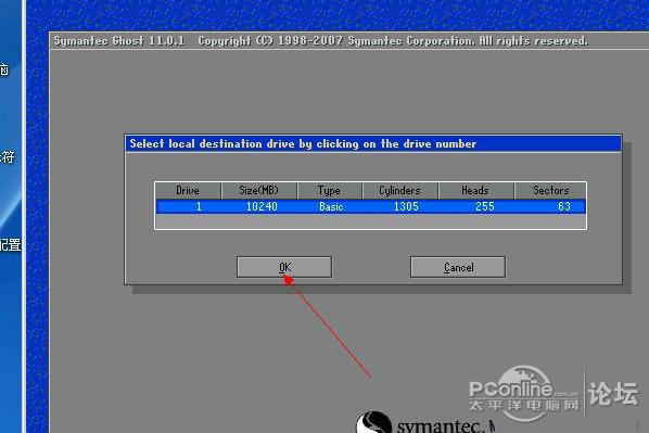 這一步是選擇安裝到哪一個硬盤。如果你有多個硬盤,大白菜官網(wǎng)請選擇你要安裝系統(tǒng)的硬盤。然后點擊[OK]進入下一步。