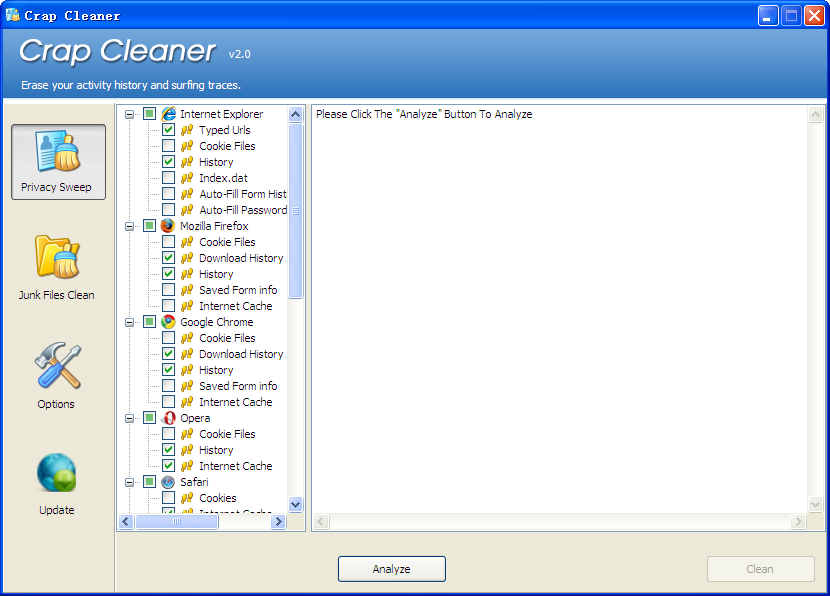 Crap Cleaner是一個100%免費的系統優化,隱私保護和清潔工具。有了它您會看到,性能立刻得到提高。它同時還可以擦掉你的活動歷史和您的計算機上網痕跡,清理臨時文件及需要的硬盤空間。